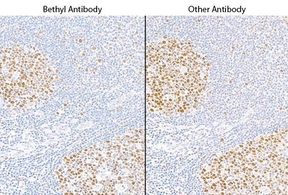 This pillar requires that two or more antibodies directed against different epitopes of a protein generate similar results. For example, two antibodies targeting different epitopes on a given protein target should produce similar staining patterns on the same tissue in an immunohistochemistry (IHC) study or produce similar results on a western blot. The majority of Bethyl antibodies are validated using independent antibodies developed in-house.