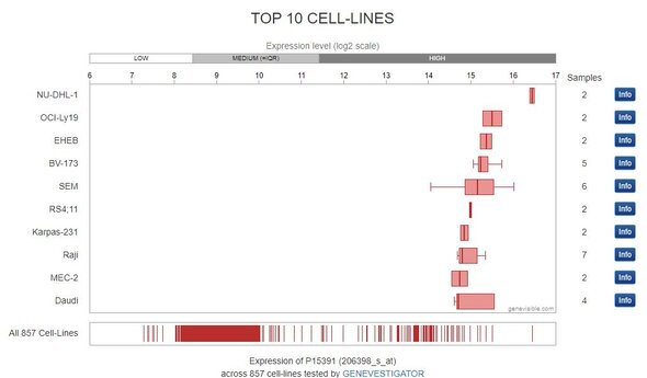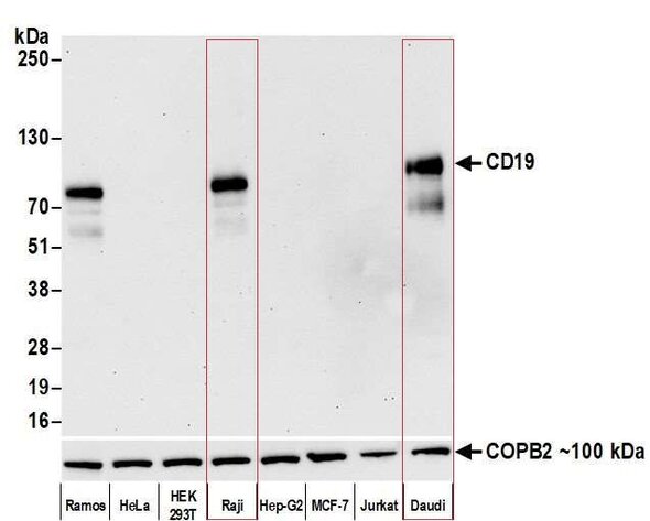 We used a public mRNA expression database (GeneVisible) to identify both Raji and Daudi cell lines as expressing the protein CD19 (this data is not provided). The corresponding western blot using our antibody of interest confirms the presence of CD19 (Bethyl antibody A700-137) in Raji and Daudi cell lysates.