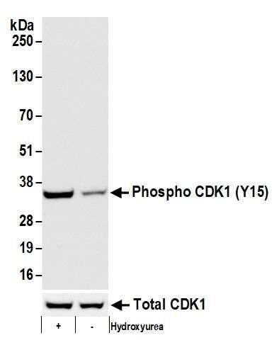 In this example, our antibody is specific for a phosphorylated version of CDK1 protein (Bethyl antibody A700-101), which is induced by the addition hydroxyurea. In this western blot, our antibody of interest detected the increased phosphorylation of CDK1 at tyrosine 15 when cells were treated with hydroxyurea.