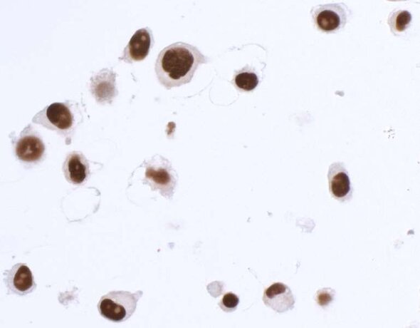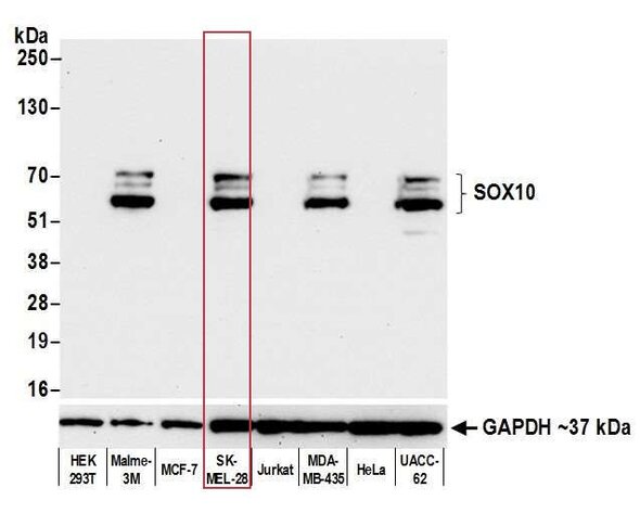 The SK-MEL-28 cell line expresses SOX10 protein. We used Bethyl antibody A700-080 to detect the SOX10 protein in cell lysate by western blot analysis (left). We used the same antibody to detect SOX10 by ICC (Right). The antibody produced complementary results in both experiments.
