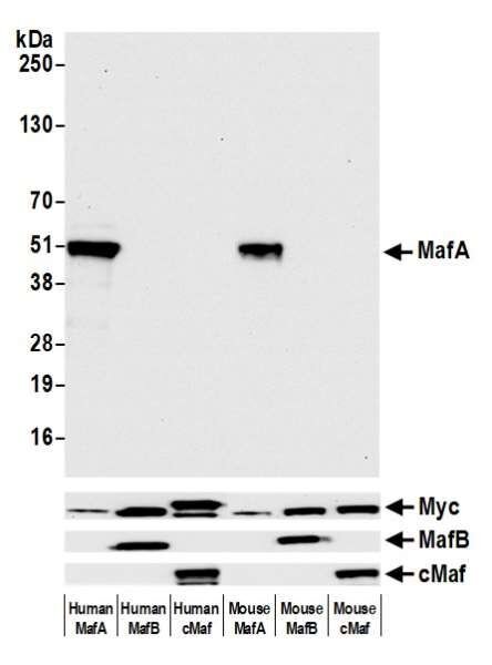 In this example of testing for cross-reactivity, we used mouse and human OE cell lines expressing MafA, MafB, and cMaf proteins. We then performed western blot of the cell lysates with Rabbit anti-MafA recombinant monoclonal antibody (A700-067) to show that our MafA antibody binds only to MafA, but not MafB or cMaf. The control bands show that the other proteins are present but are not being detected by the MafA antibody.