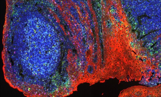 From Bethyl Laboratories in Montgomery, TX: Human tonsil crypt staining showing immune cell locations and interactions via CD3 (aqua), CD45 (blue), CD68 (yellow), FoxP3 (magenta), pan cytokeratin (red), PD-L1 (green).