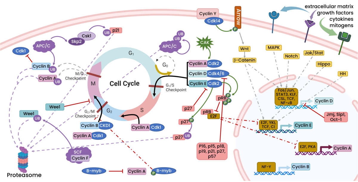 As the cell transitions between each of the phases of the cell cycle there are checkpoints to ensure that everything in the cell is approved to move on to the next phase. If there are any defects, like DNA damage, DNA actively undergoing replication, inappropriate cell size, etc, the cell can stall at the transition until the errors are corrected. There are many forms of regulation layered across these checkpoints most of which revolve around the presence of cyclins and cyclin dependent kinases. Various growth factors, stimuli, and inhibitory factors regulate the expression of cyclins and cyclin dependent kinases, many of which are illustrated in the figure below.