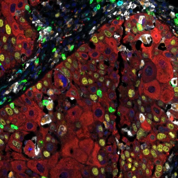 Detection of human CD3 (teal), CD8 (green), CD68 (orange), CK (red), Ki67 (yellow) and PD-L1 (white) in FFPE HNSCC by IHC-IF. Rabbit anti-CD3e recombinant monoclonal [BL-298-5D12] (A700-016), rabbit anti-CD8a recombinant monoclonal [BLR044F] (A700-044), mouse anti-CD68 monoclonal [KP-1] (A500-018A), mouse anti-cytokeratin monoclonal [AE1/AE3] (A500-019A), rabbit anti-Ki67 monoclonal [BLR021E] (A700-021) and rabbit anti-PD-L1 recombinant monoclonal [BLR020E] (A700-020). Secondary: HRP-conjugated goat anti-rabbit IgG (A120-501P) and HRP-conjugated goat anti-mouse IgG (A90-116P). Substrate: Opal™ 480, 520, 570, 620, 690 and 780. Counterstain: DAPI (blue).