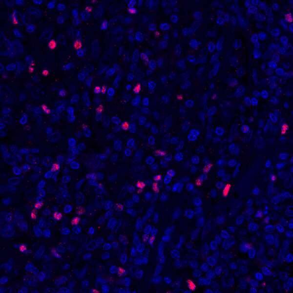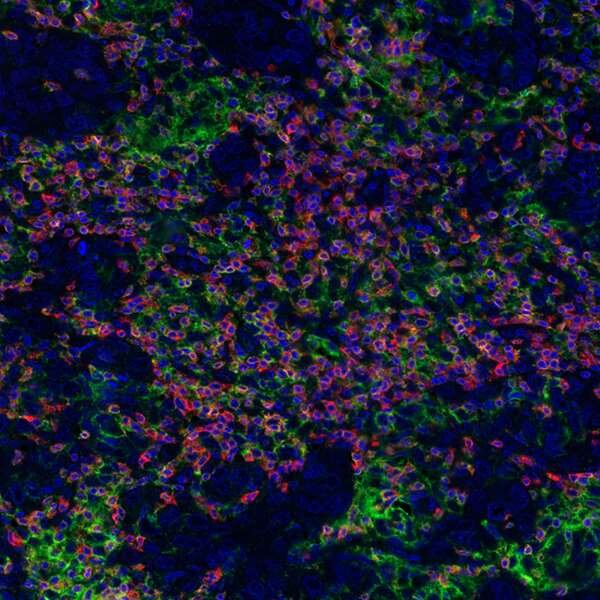 Detection of human CD3E (orange), CD8 alpha (red), and PD-L1 (green) in FFPE breast carcinoma by IHC-IF. Rabbit anti-CD3E recombinant monoclonal [BL-298-5D12] (A700-016), rabbit anti-CD8 alpha recombinant monoclonal [BLR044F] (A700-044), rabbit anti-PD-L1 recombinant monoclonal [BLR020E] (A700-020). Secondary: HRP-conjugated goat anti-rabbit IgG (A120-501P). Substrate: Opal™ 520, 620, and 690. Counterstain: DAPI (blue).