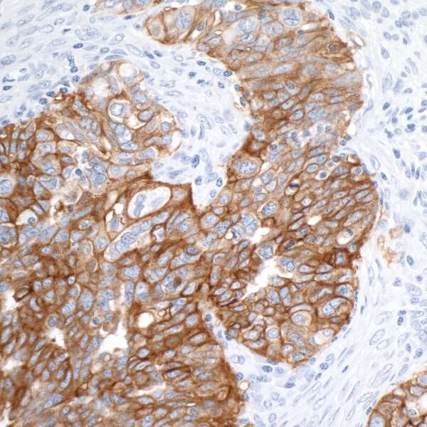 Detection of human EpCAM in FFPE ovarian carcinoma by IHC. Antibody: Rabbit anti-EpCAM recombinant monoclonal [BLR077G] (A700-077). Secondary: HRP-conjugated goat anti-rabbit IgG (A120-501P). Substrate: DAB.