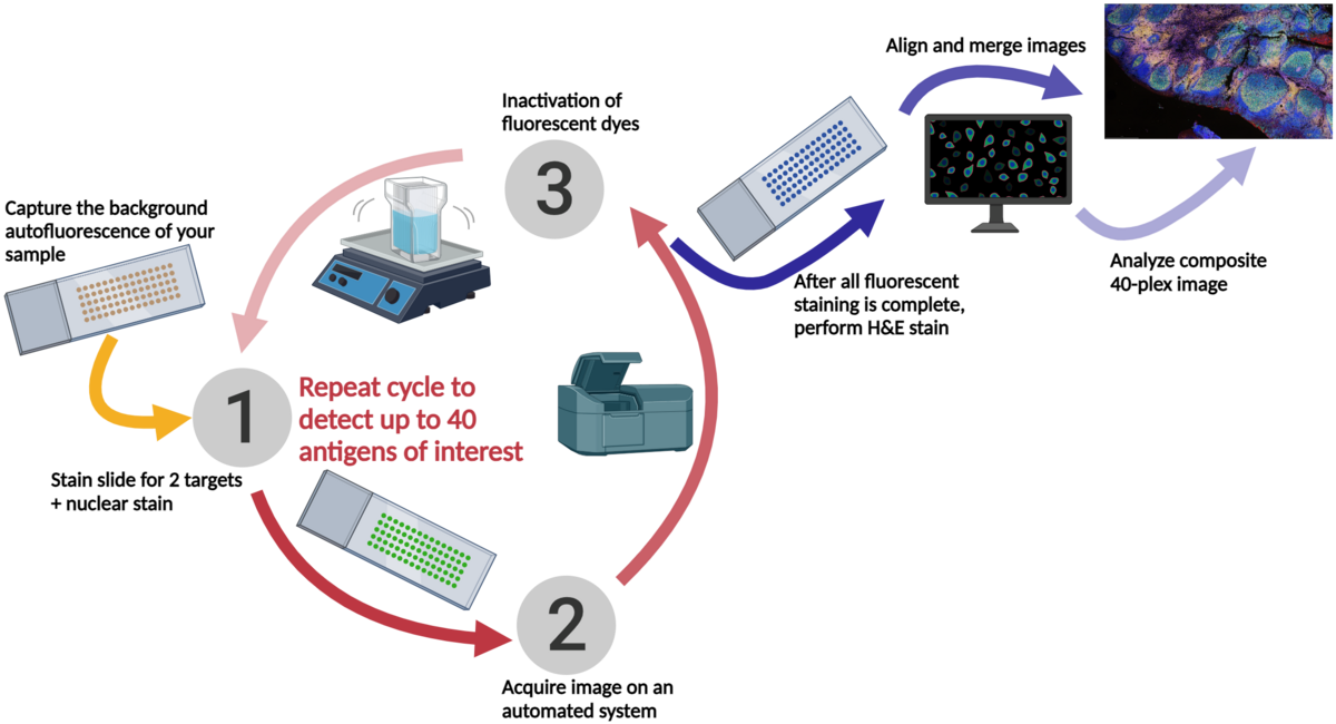 Cyclic immunofluorescence (cyclic IF or CyCIF1 and originally referred to as MxIF2) is a high-plex imaging technique. Multiple fluorophore-conjugated antibodies are added to the slide in each round of staining. After each round of imaging, the fluorescent dyes are inactivated by chemical inactivation, photobleaching, or detergent-based stripping so that the same fluorophores can be used in subsequent rounds.2 By using the same fluorophores in multiple rounds of staining, cyclic IF minimizes the need for the use of uncommon fluorophores and extensive optimization.