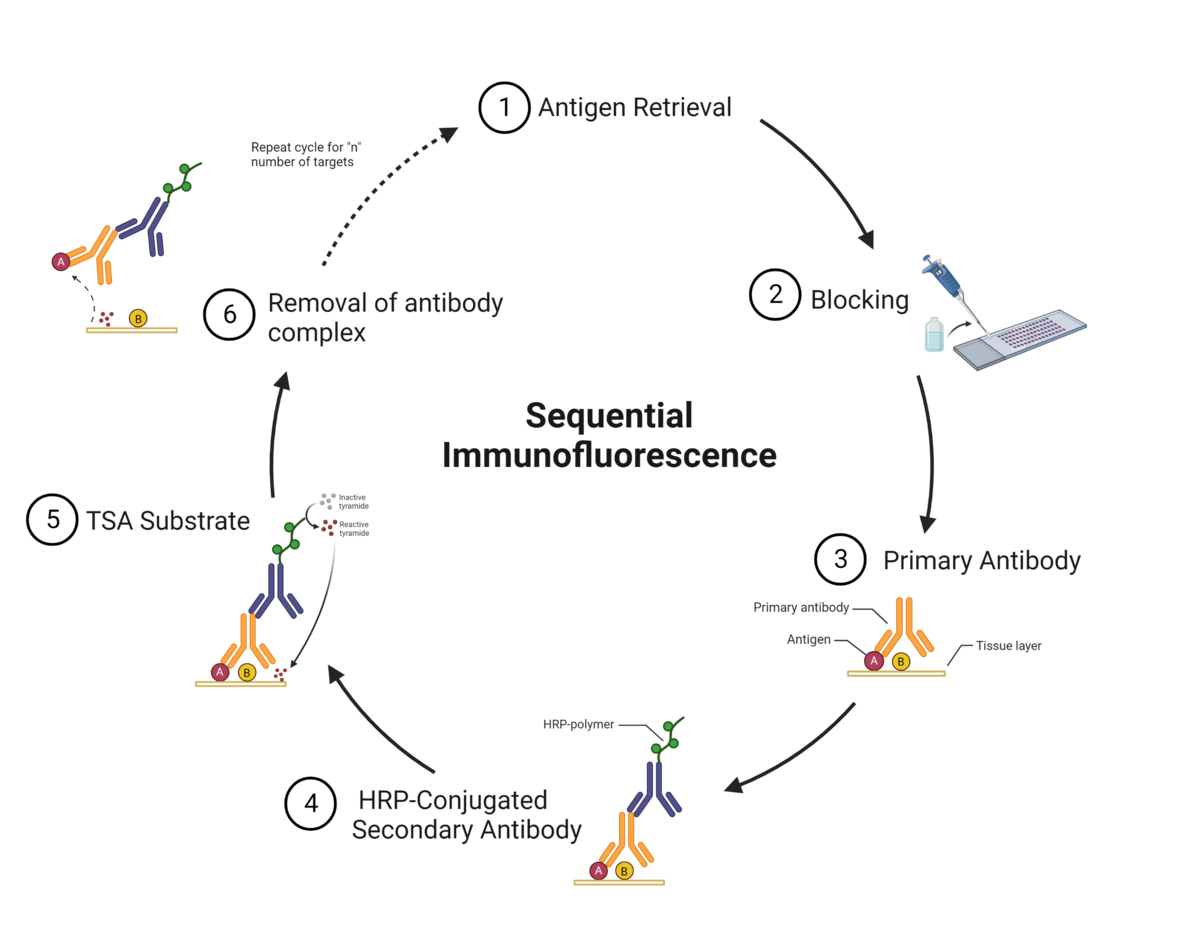 The TSA method of multiplex immunofluorescence is achieved by utilizing a basic protocol in which the primary and secondary antibodies corresponding to the first target of interest are deposited. These are then removed with heat-induced epitope retrieval (HIER), and the staining process is repeated for "n" number of targets.