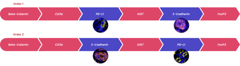 The order in which targets are applied to the tissue plays a major role in antibody activity and background intensity. Adding each antibody in the optimal position is key to ensuring a successful experiment.