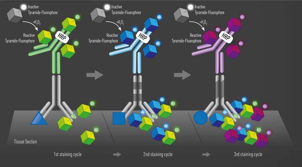 This iterative process can be performed multiple times, allowing for the detection of multiple antigens in the same tissue sample. The images acquired after each round of staining are all merged prior to being analyzed, using nuclear staining as an alignment guide.